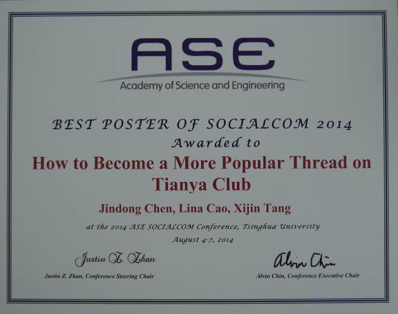 SocialCom 2014组委会为了增进大家交流与互动,8月5日下午五点-七点特意在清华大学FIT楼1层举办了Poster Session,所有23篇论文都以poster的形式参加。参会者通过与poster作者面对面地交流,了解作者的研究成果。以无记名方式选出最好的墙报。经过公开民主的选举,陈进东等人的poster被评选为 SocialCom 2014的“Best Poster”。