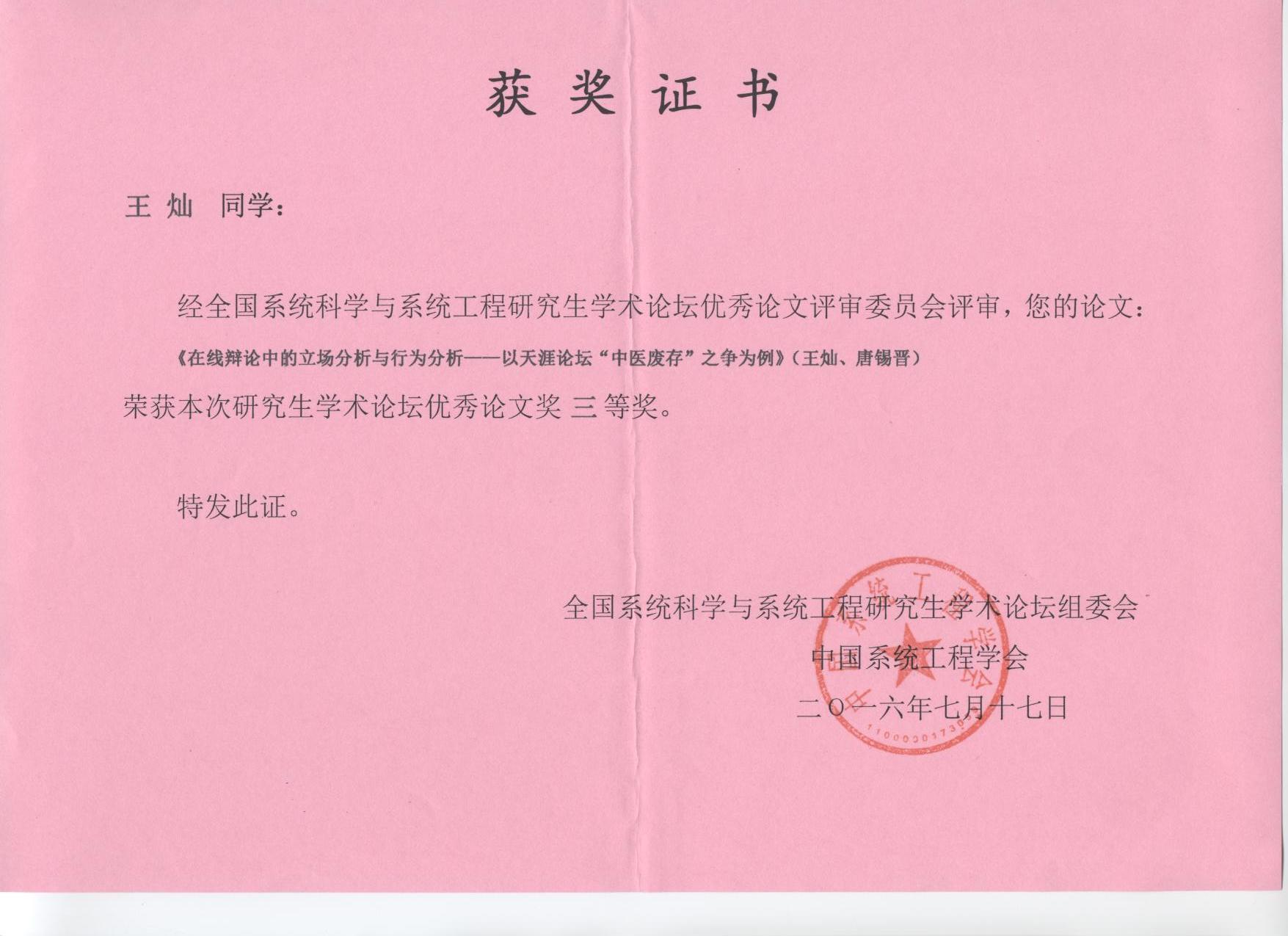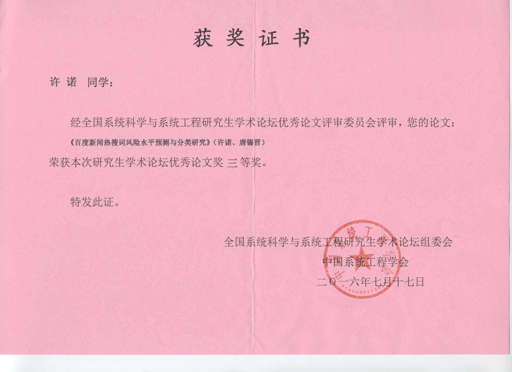 17日上午举办了全国系统学学术研讨会,郭雷院士作了题为“系统学”的大会报告,系统的阐述了系统学的发展基础以及系统学在科学技术与人类社会中的作用等。在下午闭幕式中,博士生王灿和许诺的论文均被评为研究生论坛优秀论文。