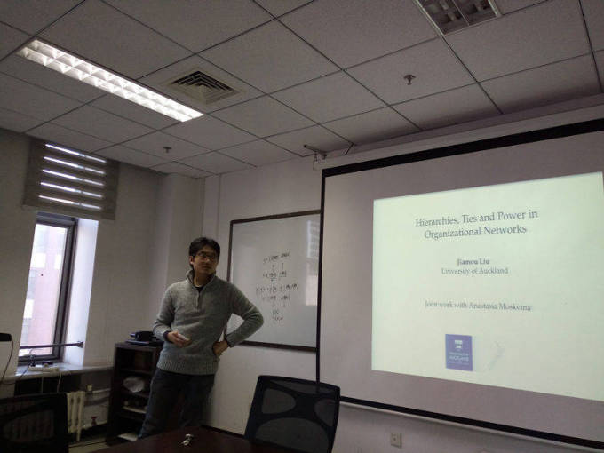 他首先参加了博士生许诺同学的“百度热搜词风险水平预测”讨论班报告,并给出了一些建议。接着刘博士做了一小时题为“Hierarchies, ties and power in organizational networks: model and analysis”的宣讲,是篇刚发表于Social Network Analysis and Mining期刊文章的主要内容。内容清晰,从组织网络顶点与边的定义出发,通过不同的组织结构层级研究了其中权力分配。在其报告中,刘博士还介绍了此项研究而开发的软件,体现了其研究的可示范和可拓展。