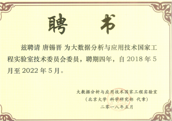 由北京大学作为理事长单位的大数据分析与应用技术国家工程实验室主办,中科院数学与系统科学研究院、中山大学、奇虎360、滴滴出行、中国信息安全研究院等常务理事单位协办,北京大学数学科学学院与北京大数据研究院联合承办的“大数据分析与应用技术创新论坛2018——暨大数据分析与应用技术国家工程实验室2018年会”于2018年5月25日在北京大学中关新园科学技术报告厅举行。会议期间举办了国家工程实验室理事会、实验室核心团队聘任与分中心授牌仪式、该会议通过实验室年度报告、大会特邀报告、专题报告等,围绕大数据分析与应用技术领域当前重大创新课题深入交流研讨,引领支撑产学研协同创新机制与平台建设。 唐锡晋研究员作为大数据分析与应用技术国家工程实验室常务理事单位代表随同实验室常务理事、CAS-MADIS主任杨晓光研究员出席了年会,并出任大数据分析与应用技术国家工程实验室技术委员会委员, 由主任鄂维南院士亲自颁发证书。作为该实验室共建单位之一,中科院数学与系统科学研究院承接智能知识管理与决策支持平台分中心,以发挥参与成员的专业研究优势。大数据分析与应用技术国家工程实验室于2017年3月21日正式揭牌。因时间冲突,MSKS小组仅冷洁同学参加了2018年下午的专题报告环节。 关键词: 大数据分析与应用,智能知识管理与决策支持平台,国家工程实验室