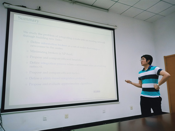 刘老师首先作了题为"Social Network Integration: a structured perspective (针对动态社会关系网络融合的结构化研究)"的学术报告。报告主要围绕的问题是一个新人进入网络时,如何通过建立有效的连接,快速地进入网络的中心,分别讨论了静态网络和动态网络的方法,引入“信息经纪”(information brokerage)的概念,分析新人在进入演化的网络时,既考虑关键联结对象,也考虑建立连接自身投入成本和回馈。通过采用现实世界的国家贸易网络、社交网络等实际网络数据和BA等经典网络模型,比较了不同策略的有效性。