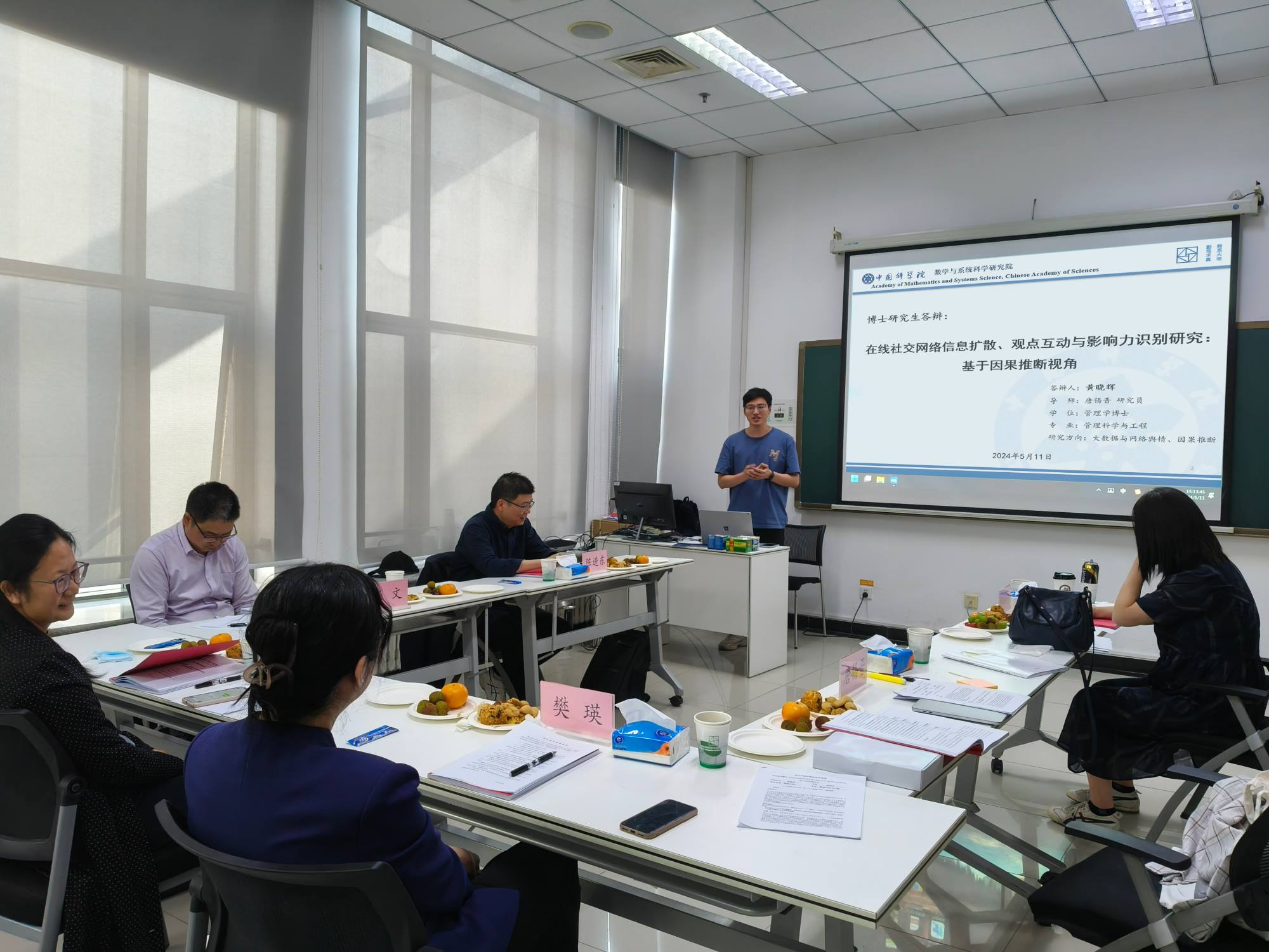 2024年5月11日下午2:00,综合集成与知识科学研究小组2019级硕博连读生黄晓辉同学的学位论文答辩在数学院南楼212会议室举行。答辩主席由中国科学院数学与系统科学研究院张松懋研究员担任,答辩委员会还包括中国科学院大学经济与管理学院张玲玲教授,北京师范大学系统科学学院樊瑛教授,北京工业大学经济管理学院张文教授以及北京信息科技大学经济管理学院陈进东教授。小组的唐锡晋研究员与其他同学也旁听了本次答辩。