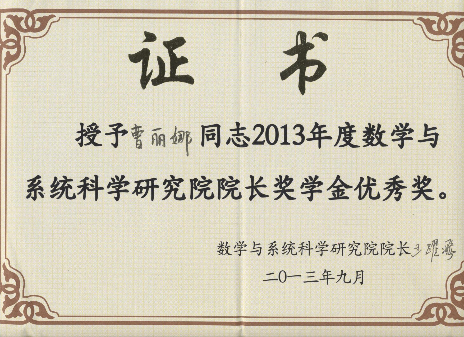 祝贺曹丽娜同学荣获院长奖学金优秀奖
